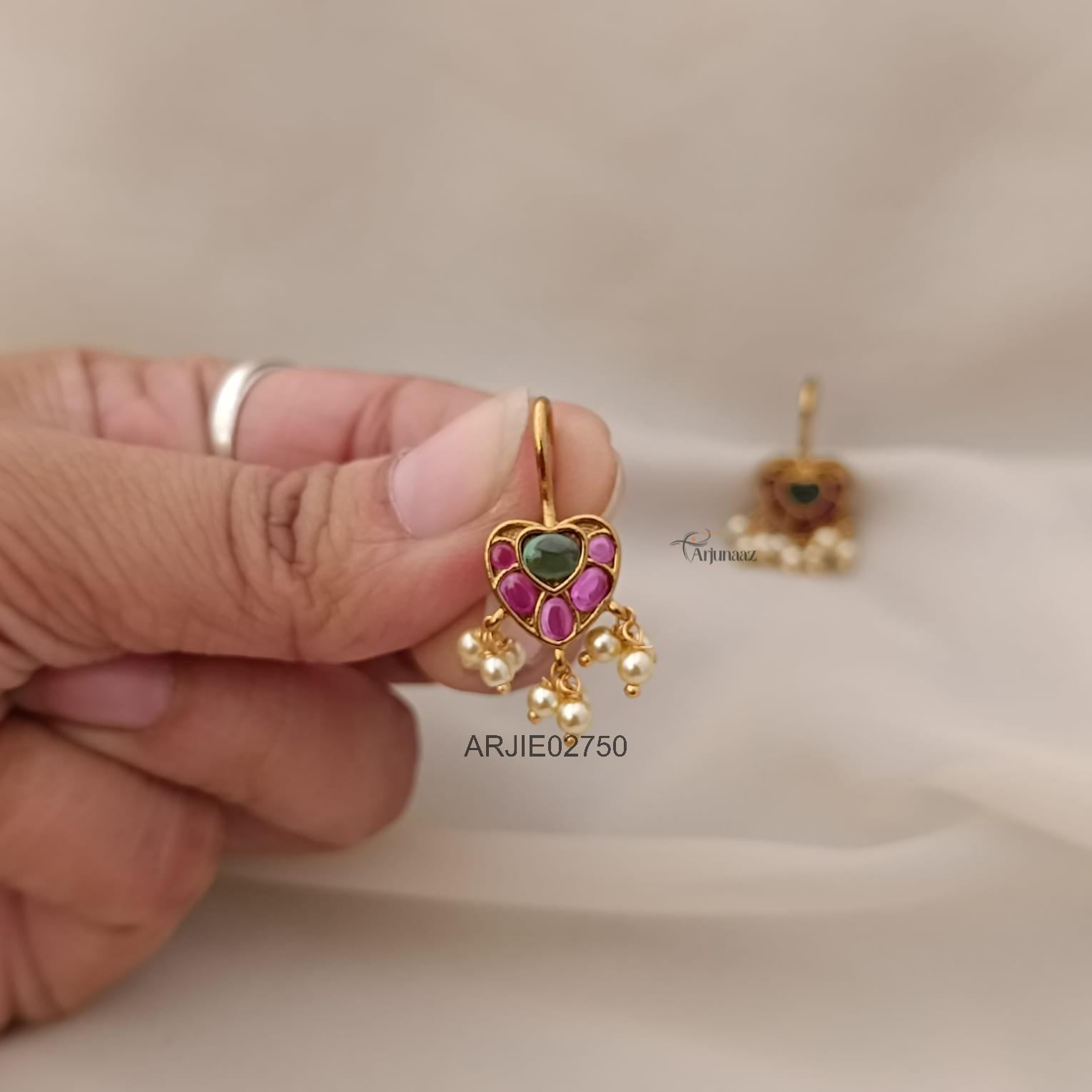 Antique Kemp Hook Drop Earrings exude vintage charm and timeless elegance. Adorned with traditional Kemp stones in rich red and green hues, they feature intricate designs inspired by South Indian heritage.