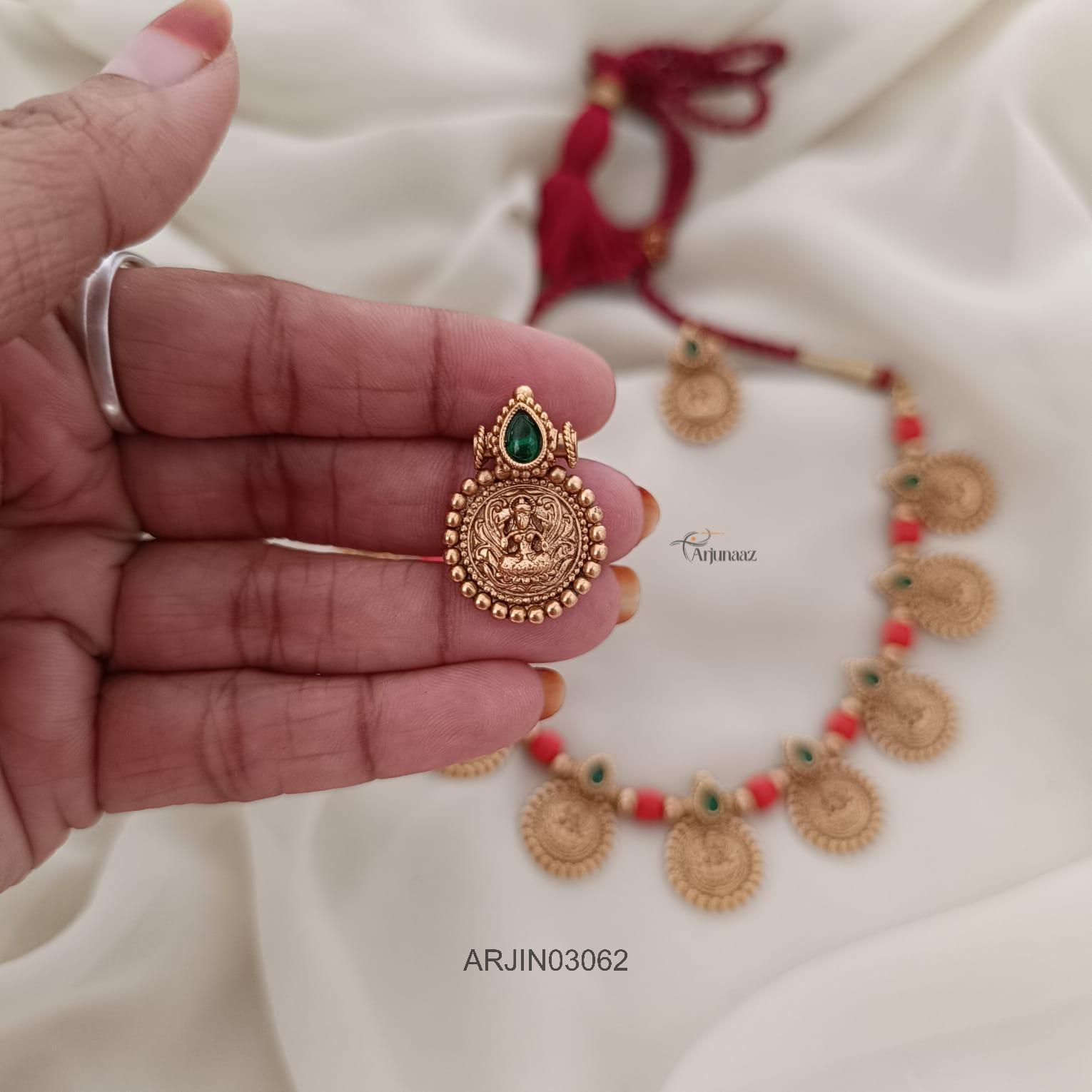 A Coral and Lakshmi Thread Necklace blends sacred symbolism with vibrant elegance. Rich red coral signifies protection and prosperity, while the Lakshmi motif invokes divine abundance.