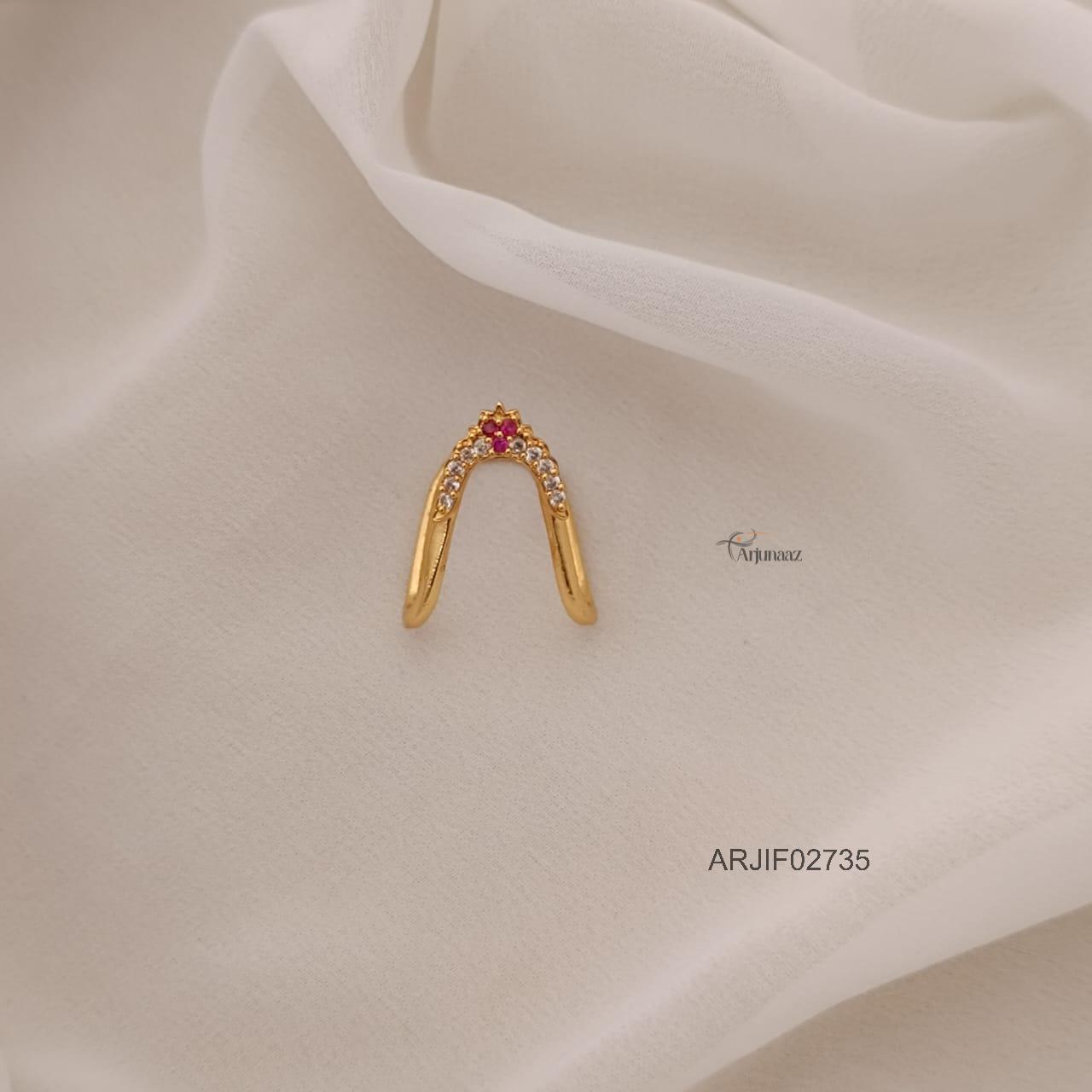 The Ruby and White Vanki Finger Ring radiates regal charm with its traditional v-shaped design. Embellished with vivid ruby and sparkling white stones, it symbolizes purity and strength. Meticulously crafted, this ring blends classic temple artistry with modern elegance, making it ideal for weddings, festivals, and graceful everyday wear.
