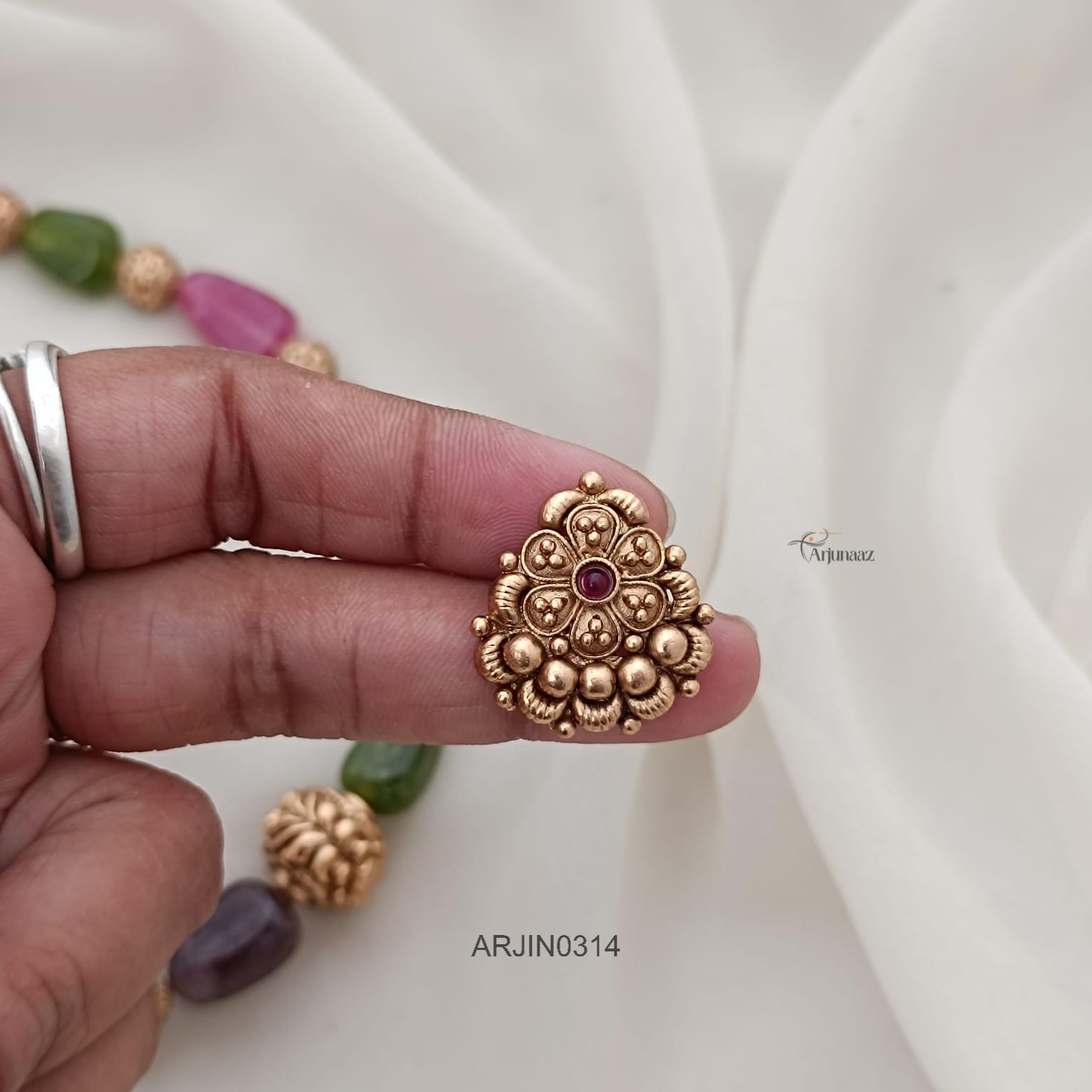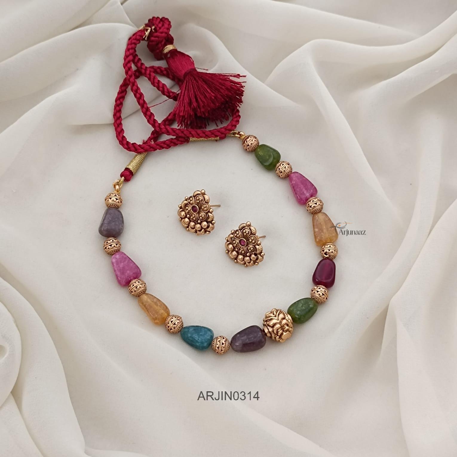 A semiprecious beads thread necklace features natural stones strung on a soft thread, blending earthy charm with artisan style. Each bead carries unique colors and textures, offering a handcrafted feel. Lightweight and versatile, it pairs well with casual or ethnic wear, adding a subtle yet distinctive touch to any outfit.