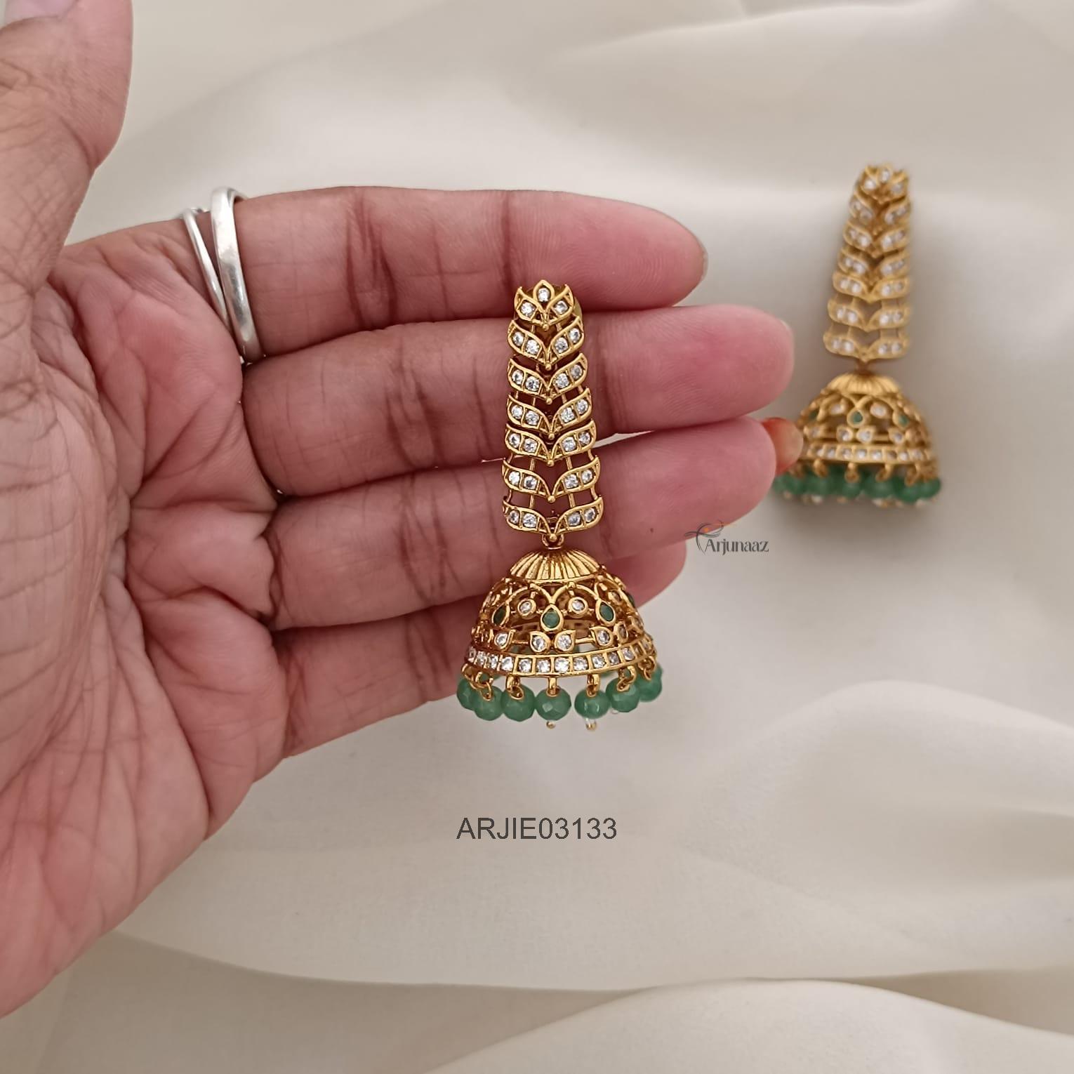 Traditional long jhumkas are elegant Indian earrings known for their bell-shaped design and intricate craftsmanship. Often adorned with pearls, beads, or temple motifs, they create a graceful, swaying effect.